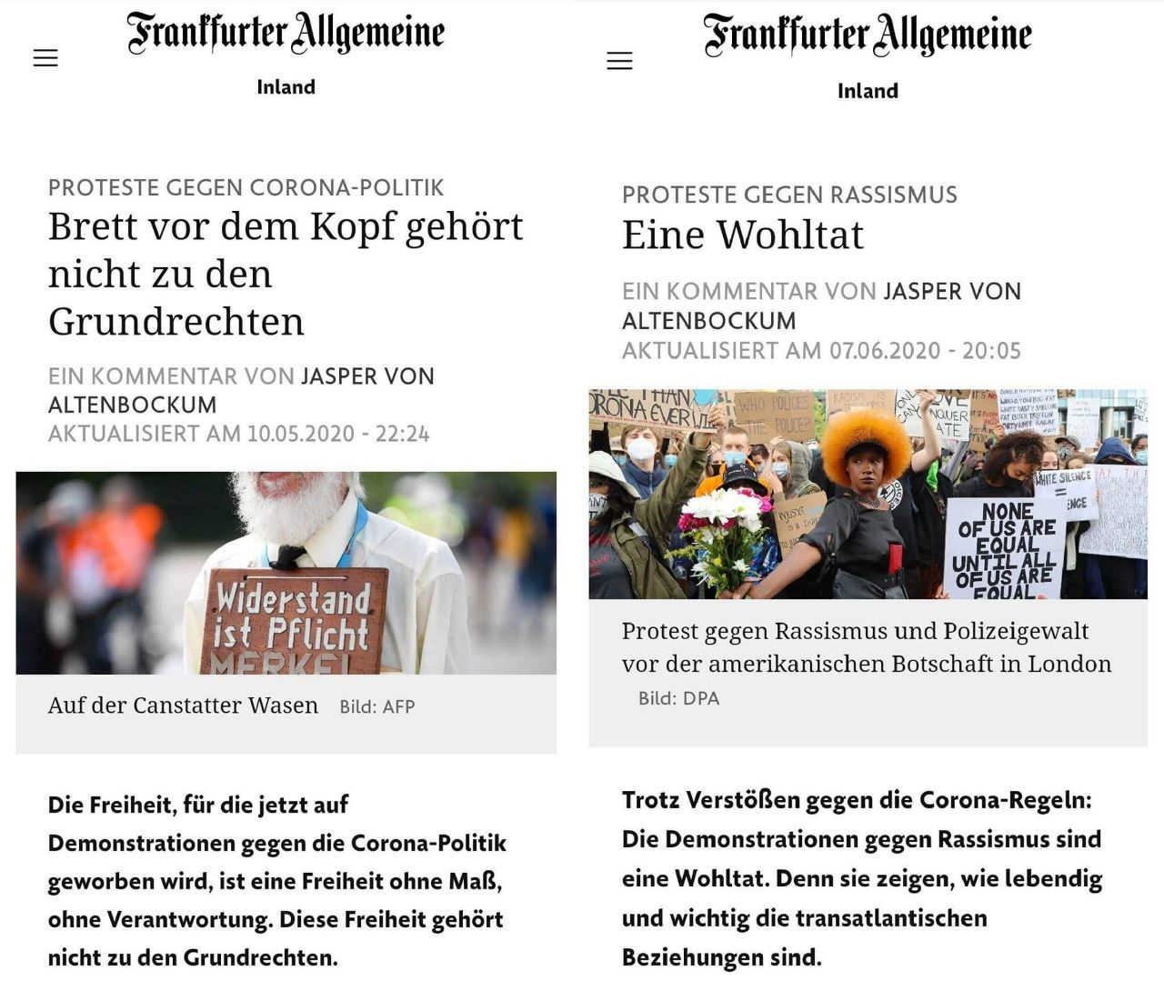 1. | Am 10. Mai 2020 äußert sich Altenbockum in der FAZ zu den Demonstrationen gegen die aktuelle Corona-Politik: "Proteste gegen Corona-Politik - Brett vor dem Kopf gehört nicht zu den Grundrechten". Er meint: "Die Freiheit, für die jetzt auf Demonstrationen gegen die Corona-Politik geworben wird, ist eine Freiheit ohne Maß, ohne Verantwortung. Diese Freiheit gehört nicht zu den Grundrechten. Nur knapp einen Monat später, am 7. Juni 2020 kommentiert er im selben Schmierenblatt: "Proteste gegen Rassismus - Eine Wohltat". In seinem links-triefenden Kommentar heißt es: "Trotz Verstößen gegen die Corona-Regeln: Die Demonstrationen gegen Rassismus sind eine Wohltat. Denn sie zeigen, wie lebendig und wichtig die transatlantischen Beziehungen sind." [1] |