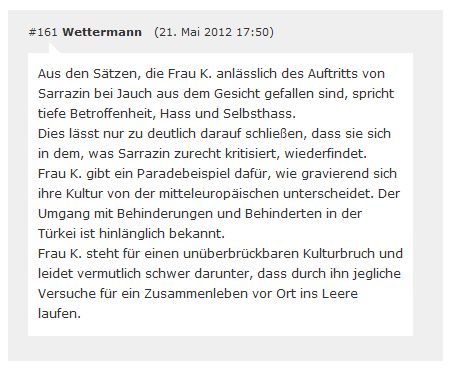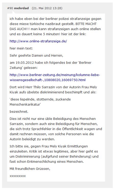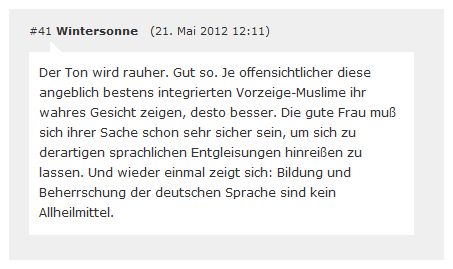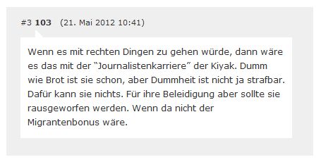2. | "Wieso sind die Mitarbeiter in Sicherheitsbehörden, Medien und Politik so wenig multi-ethnisch? Der öffentliche Druck auf diese Themen wäre in den letzten 20 Jahren anders ausgeübt worden. Noch sind keine hochrangigen Politiker in Demut und Scham vor die Opferfamilien getreten und haben um Verzeihung gebeten. Noch haben Journalisten sich für ihre vorurteilsvolle und diskriminierende Berichterstattung über Belange der migrantischen Bevölkerung über Jahre hinweg nicht entschuldigt. Noch gab es keine aufrichtigen Rücktritte. Weil man immer noch eine Differenz zwischen organisierten Rechtsextremen und 'normal rassistisch' denkender Bevölkerung sieht. Das ist eines unserer grundsätzlichen deutschen Probleme. Der eigentliche Skandal." [2] |