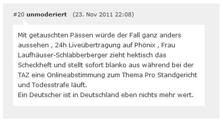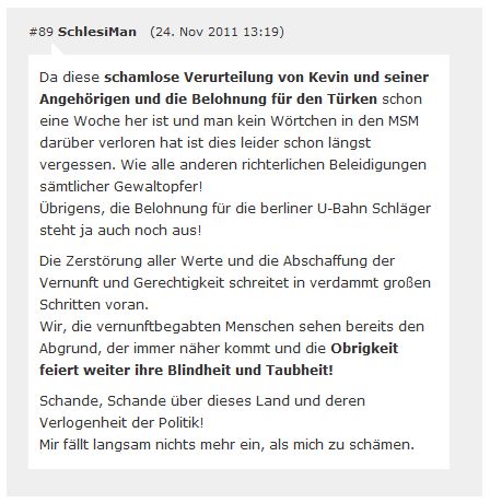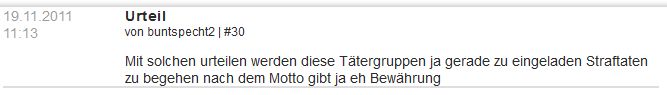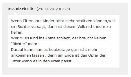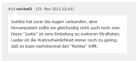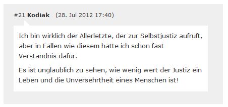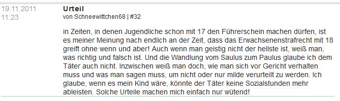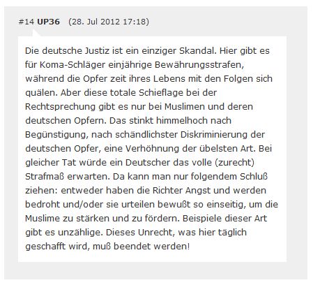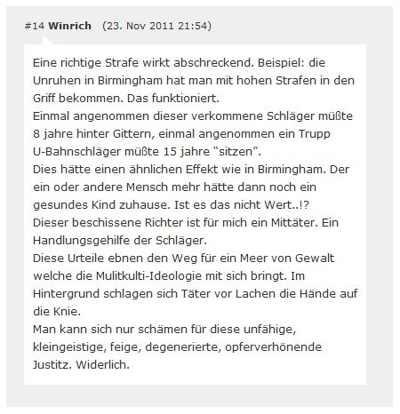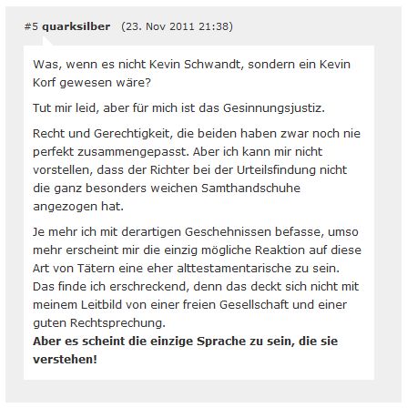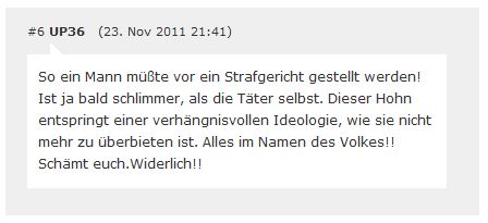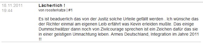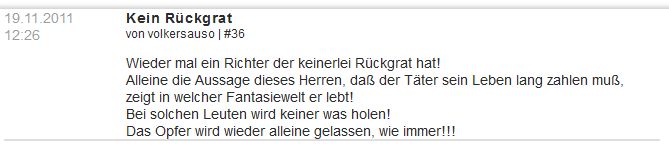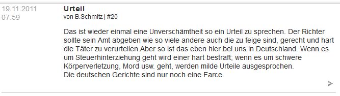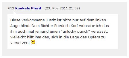 1. | Am 20.11.2011 verurteilte Korf in seiner Funktion als Amtsrichter den Täter Erdin K. trotz schwerster und andauernder Verletzungen des Opfers zu einer Bewährungsstrafe von einem Jahr und 120 Sozialstunden. [1] [2] [3] [4] [5] |